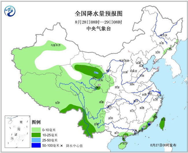 西北西南地区多小到中雨:8月27至30日,青藏高原、甘肃、宁夏、陕西南部、西南地区等地部分地区有小到中雨,局地大雨。