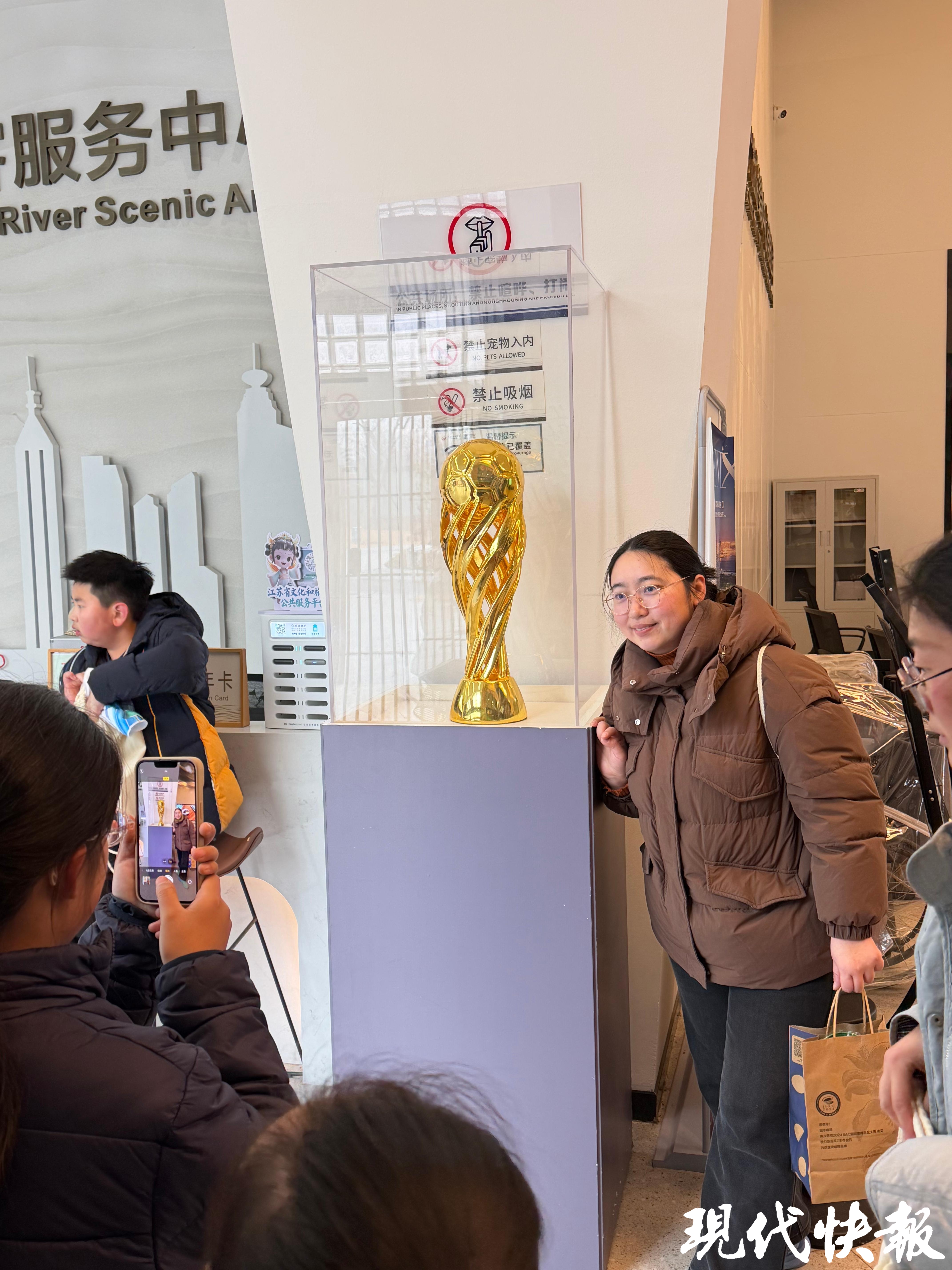 苏超冠军城泰州,市民游客和苏超冠军杯撞个满怀。一早,苏超冠军奖杯在古盐运河广场游客中心进行展出,吸引众多市民游客前来拍照打卡。现场很多小朋友参加“踢球入筐”“颠球互动”等游戏环节,体验苏超赛场的热烈氛围。“带小朋友来参加欢乐跑的活动,一看到苏超冠军奖杯展出,赶紧过来打卡,感受这份城市荣耀,这是非常难得的机会。”市民李先生激动地说,当天他给孩子拍下了很多张与冠军奖杯的合影。
